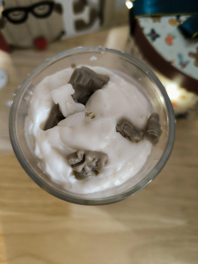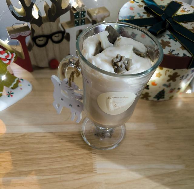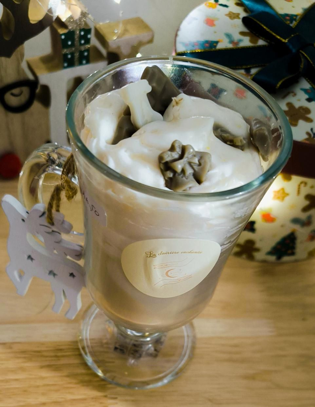 Retrouvez les délicieuses effluves de macchiato avec cette bougie gourmande chantilly parsemée de petites décorations de Noël.